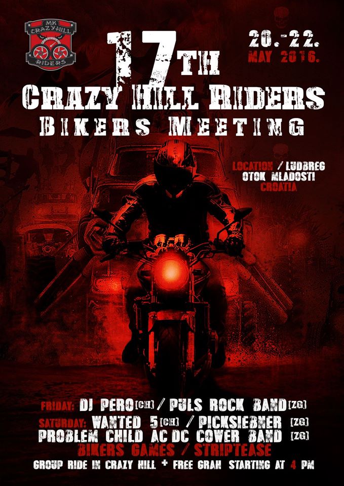 I ove godine će kod MK Crazy Hill Riders Iz Ludbrega biti 17 motorijada od 20. do 22.05.2016. Dobra zabava i svirka uz obilje pića i hrane su osigurani. Za sve zaintresirane članove MK Orlovi je okupljanje 21.05.2016. u 14.30 sati ispred Fortune u Maloj Subotici. Vidimo se.Sretan Uskrs 2016.