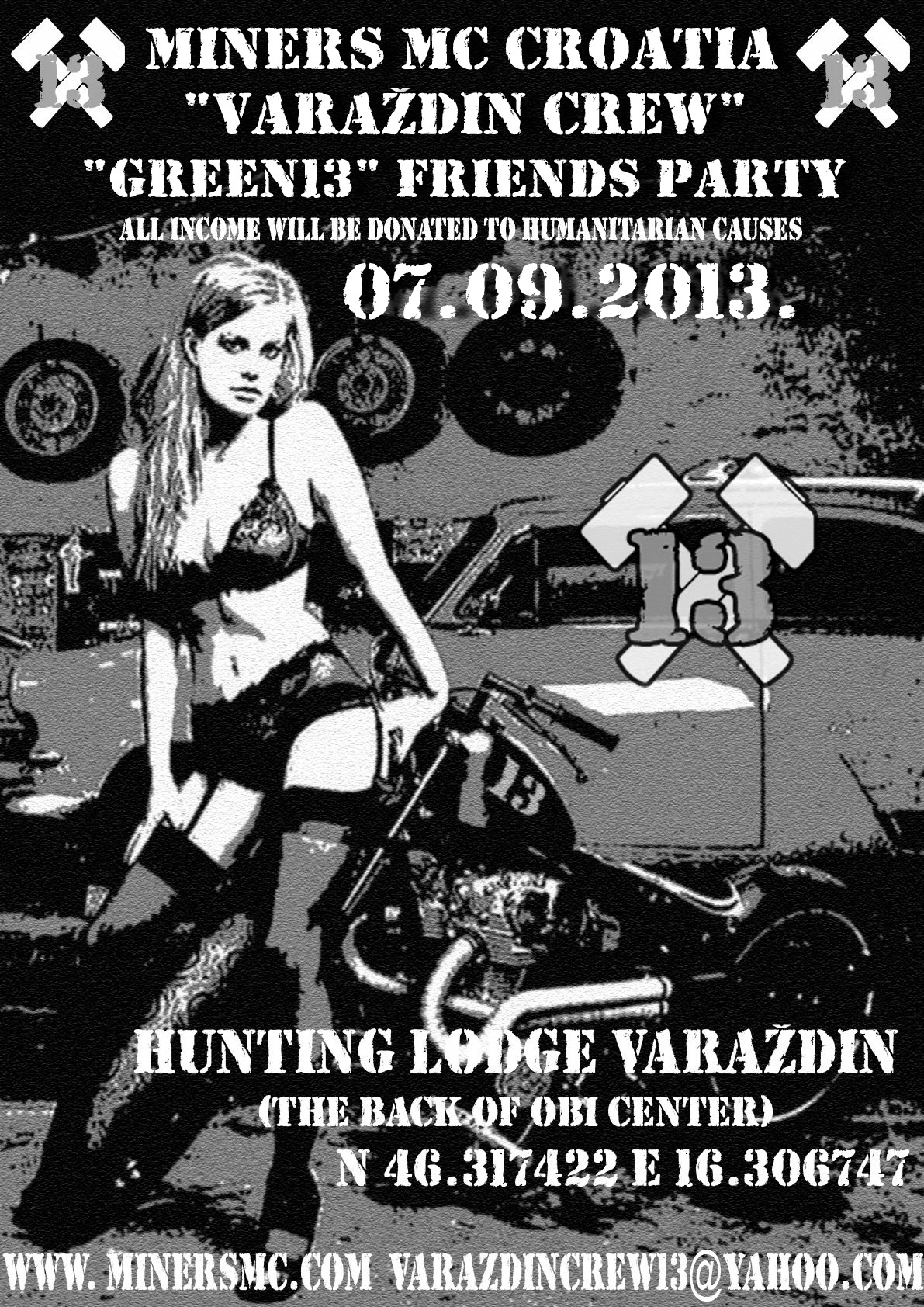 MINERS MC CROATIA "VARAŽDIN CREW" organiziraju "GREEN13"FRIENDS PARTY 07.09.2013. Prostor L.D.Fazan Varaždin, Optujska b.b.,Varaždin(iza OBI centra).Polazak ispred moto kluba u subotu po dogovoru. Za detalje nazvati predsjednika kluba.