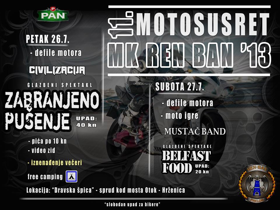 Obavještavamo sve članove, prijatelje i simpatizere da s nama proslavite rođendan našeg moto kluba. Popodnevno druženje će se održati 17.08.2013. Piće i klopa po akcijskim cijenama su zagarantirani uz dobru glazbu. Vidimo se. Detalji sljede uskoro.MK Ren Ban moto susret 2013.
